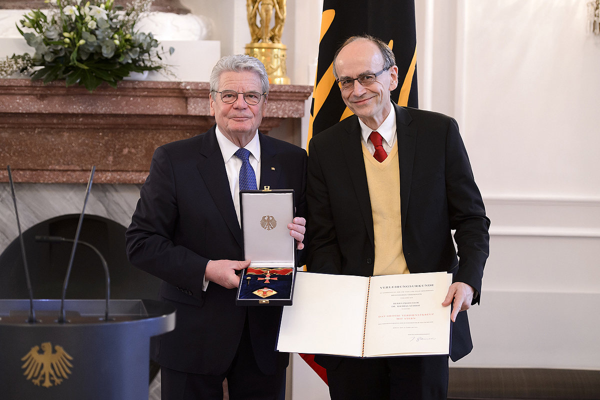 Der Nobelpreisträger für Medizin oder Physiologie des Jahres 2013, Prof. Dr. Thomas C. Südhof, und der Nobelpreisträger für Chemie des Jahres 2014, Prof. Dr. Stefan Hell, haben heute das ihnen verliehene Große Verdienstkreuz mit Stern des Verdienstordens der Bundesrepublik Deutschland ausgehändigt bekommen. „Mit dieser Auszeichnung würdigt der Bundespräsident die herausragenden Forschungsleistungen dieser weltweit anerkannten Wissenschaftler“, heißt es dazu aus dem Bundespräsidialamt, und weiter: „Professor Südhof, der die Synapsen im Gehirn und deren Kommunikation miteinander erforscht, hat Entscheidendes über den Vesikeltransport in Körperzellen herausgefunden. Seine Erkenntnisse bieten mögliche Ansätze für Therapien gegen neuronale Erkrankungen wie Alzheimer und Parkinson.“