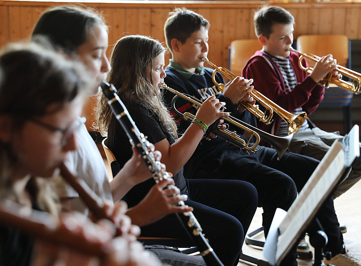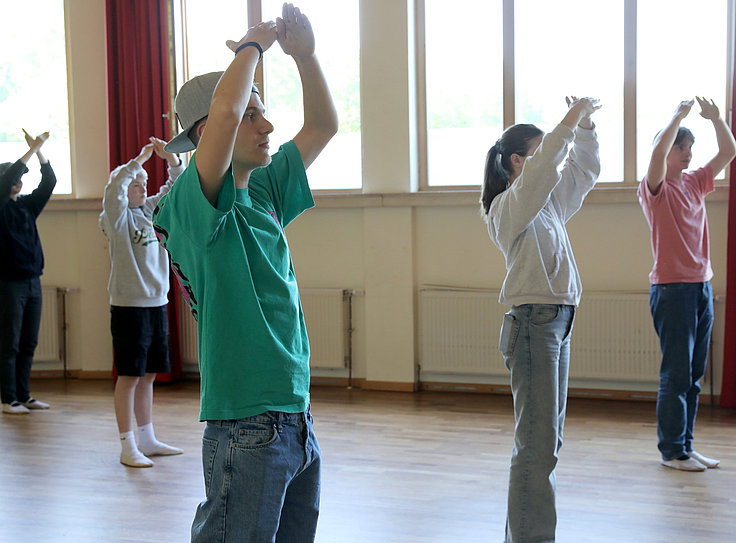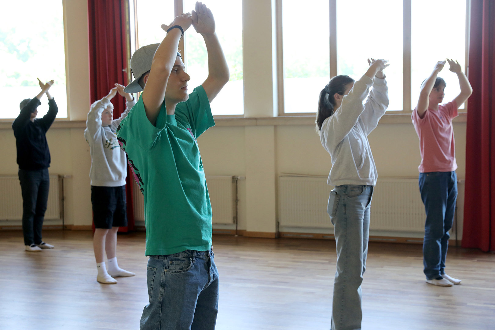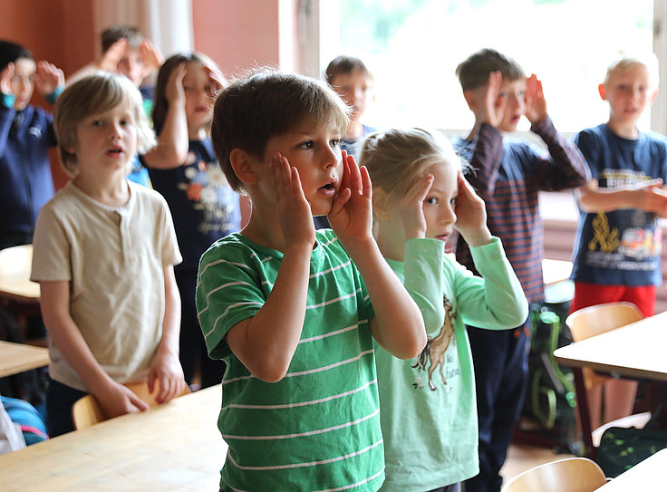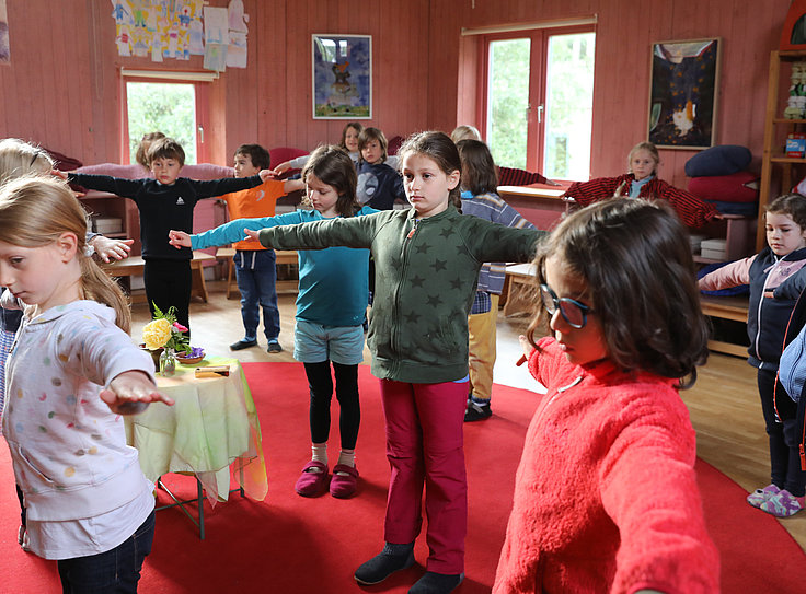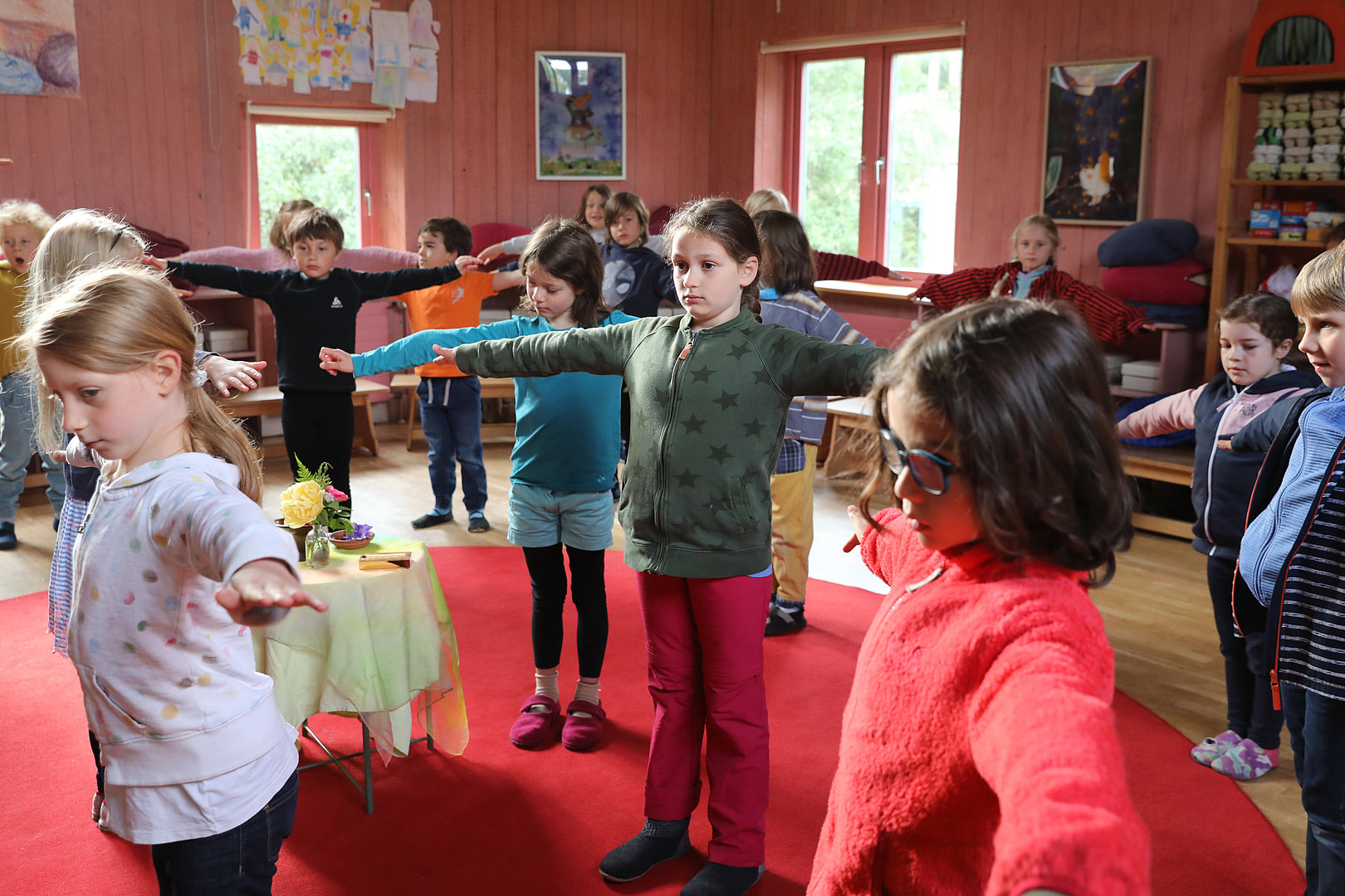 Sprache, Musik, Rhythmus und Bewegung werden in einem rhythmisch gegliederten Wechsel geübt. Die bei den jüngeren Kindern oft noch reichen Nachahmungskräfte helfen ihnen, Gedichte, Lieder, aber auch das "1x1" aktiv aufzunehmen. Durch ihr fortlaufendes künstlerisches Üben erwerben die Kinder einen reichen Erfahrungsschatz im differenzierten Wahrnehmen und schöpferischen Gestalten - zwei Grundkräfte eines Lernens, das neben den kognitiven Kräften der Kinder auch ihr Gefühls- und Willensleben anregen will. Das gemeinsame Üben hilft den Kindern auch, sich als Gemeinschaft zu erleben und fördert ihre Fähigkeit, mit Konflikten umzugehen. Angesichts des Bewegungsmangels, dem viele Kinder heute schon in der Vorschulzeit ausgesetzt sind, gewinnt dieser "rhythmische Teil" des Unterrichtes eine zunehmende Bedeutung als Mittel, die daraus resultierenden Entwicklungsrückstände aufzuholen.
