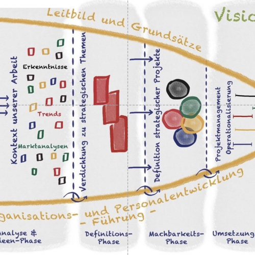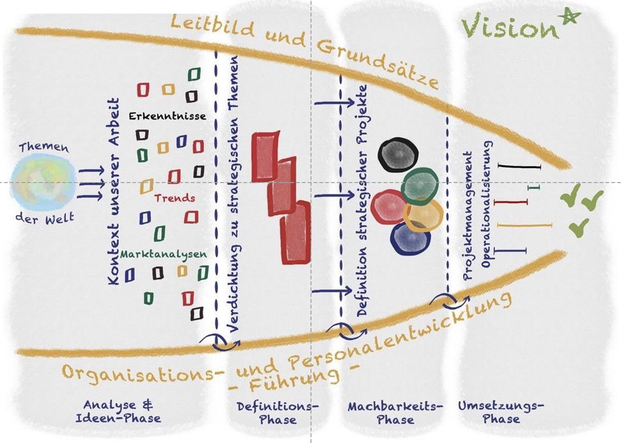 Nach einer Diagose des Ist-Zustands mit Zusammenstellung von Bedingungen, Herausforderungen und Problemen wurden diese verdichtet zu sechs Themenfeldern. Innerhalb dieser Themenfelder werden in den kommenden Jahren Projekte identifiziert und aufgesetzt, die von Gruppen, jeweils besetzt mit Fachmenschen auf dem Gebiet, bearbeitet werden sollen. Tiefgreifende Veränderungen müssen von der Mitgliederversammlung beschlossen werden, weshalb eine breite Basis geschaffen werden soll.