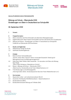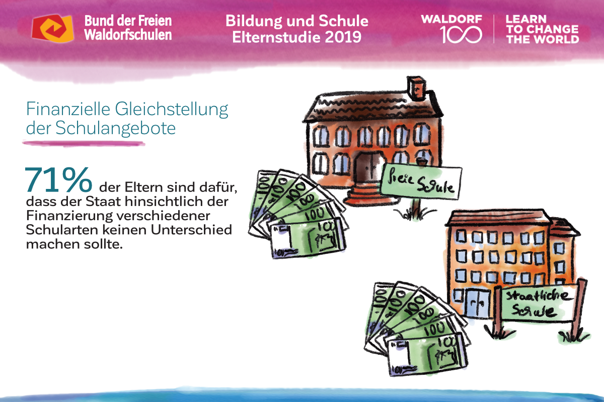 Gäbe es eine echte Wahlfreiheit zwischen staatlichen, konfessionellen und freien Schulen, würde mehr als die Hälfte der Eltern ihr Kind auf eine freie Schule schicken. Zudem sprechen sie sich klar gegen das notengebundene Leistungsprinzip an deutschen Schulen aus und wünschen sich vielmehr einen kreativen, individuell auf die Kinder und ihre Fähigkeiten eingehenden Unterricht. Klare Stellung beziehen Eltern auch bei der Frage nach der Schulfinanzierung: Während fast alle der Meinung sind, dass der Staat insgesamt zu wenig Geld für Bildung ausgibt, fordern mehr als 80 Prozent dass Eltern und Kinder das Recht haben sollten, sich ohne Zusatzkosten für die Schule ihrer Wahl entscheiden zu können. Entsprechend ist eine deutliche Mehrheit der Eltern der Meinung, dass der Staat hinsichtlich der Finanzierung staatlicher und freier Schulen keinen Unterschied machen sollte.