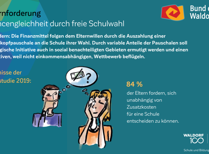 Auch am 100. Geburtstag der Waldorfpädagogik ist unser Blick in die Zukunft gerichtet. Wir setzen uns mit aller Kraft für ein zukunftsfähiges Schulwesen ein, das die Individualität der Schülerinnen und Schüler, die Professionalität der Lehrkräfte und die Mündigkeit der Eltern gleichermaßen ernst nimmt. Um dieses Ziel zu erreichen und die erforderlichen Debatten anzuregen, haben wir unsere Vision in „7 Kernforderungen an die Bildungspolitik“ zusammengefasst. Die Ergebnisse der Elternstudie 2019 zeigen eindrucksvoll, dass viele unserer Forderungen den Wünschen und Forderungen der deutschen Schuleltern an das System Schule mehrheitlich entsprechen.