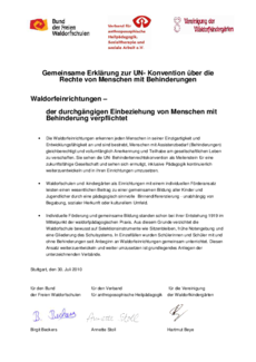 In ihren gemeinsamen Erklärungen zur UN-Konvention bekennen sich der Bund der Freien Waldorfschulen, der Anthropoi Bundesverband und die Vereinigung der Waldorfkindergärten zu der Idee der Inklusion im Geiste der UN-Konvention.